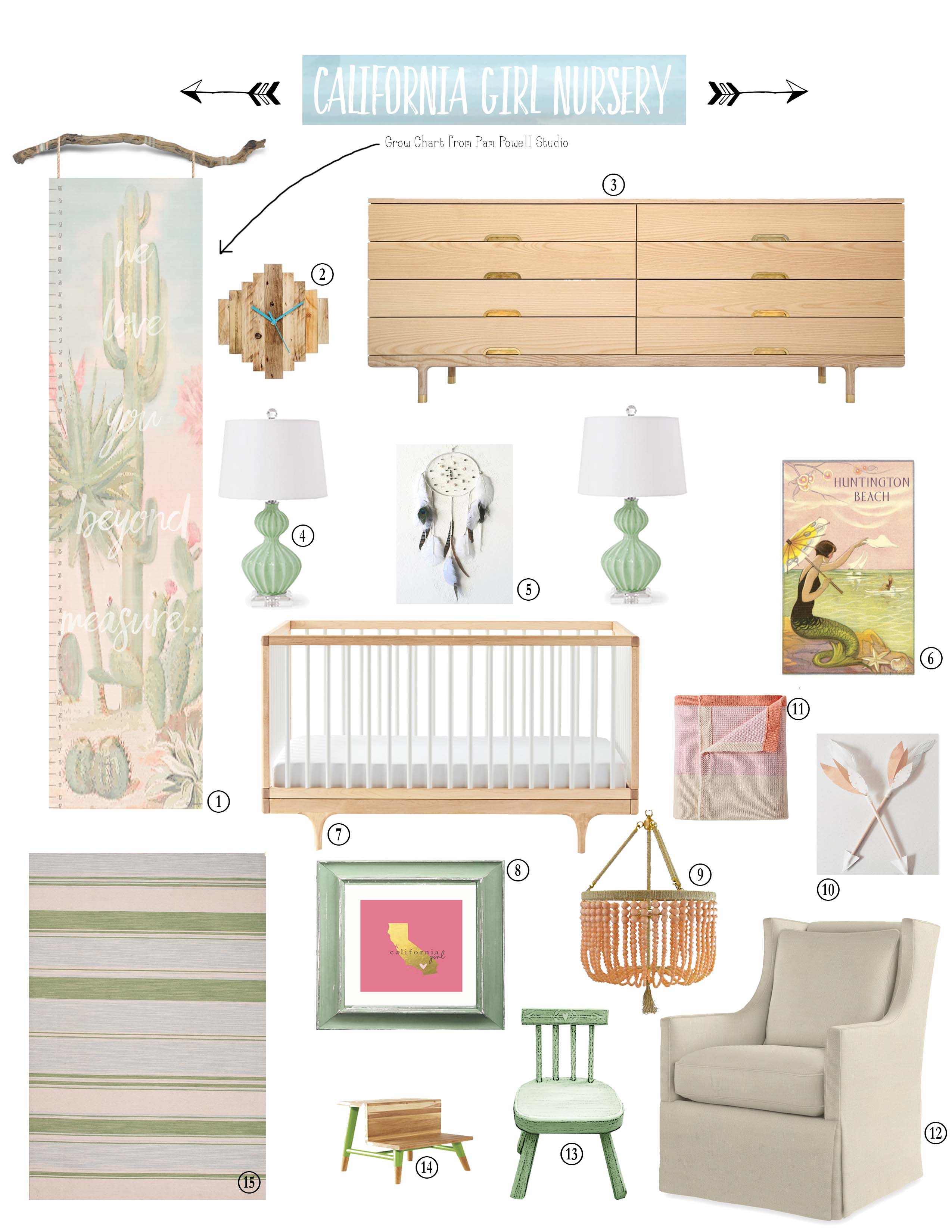 Just finished painting some gifts for a “California Girl’s” baby girl room. After Perusing all the great new kids room decor online I decided to put together a fun “BabyRoomScape” with some really sweet furnishings I stumbled upon. Enjoy!